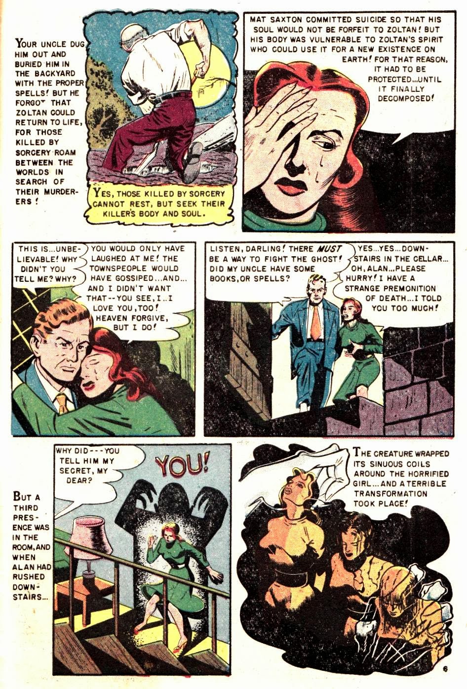 The art in the second story may vary a little in quality over the course of things, but you can't shake a stick at the Nosferatulike horror impressionism at the bottom of page six. That is some very heady, very ambitious stuff, especially coming from a time when most comic stories didn't really articulate continuity of motion from panel to panel. Here this guy has directed a whole scene of phantasmagoria in just one panel. Nice.