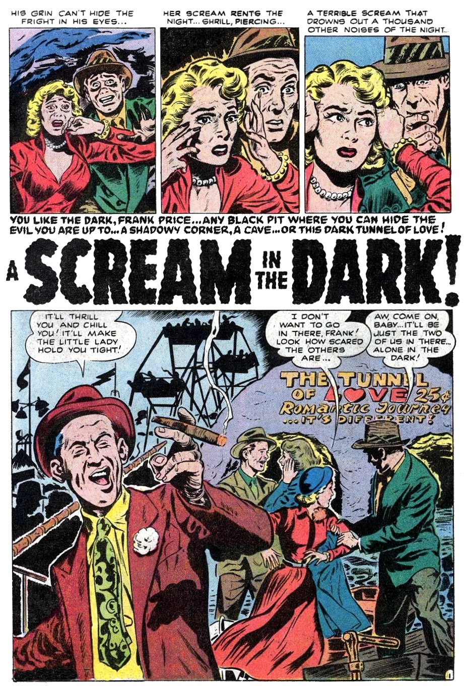 Love is in the scare all this month, and we mean it, seriously-- it's so strong you can smell it! But *yawn* maybe we've done this all before, so how about we try something different? Say, maybe a 25 cent ride through the 'ol Tunnel of Love'll do the trick? Mr. Karswell highly recommends that you give it a whirl, you might even come out the other side as a totally changed person. From the January 1953 issue of Mystic #16.