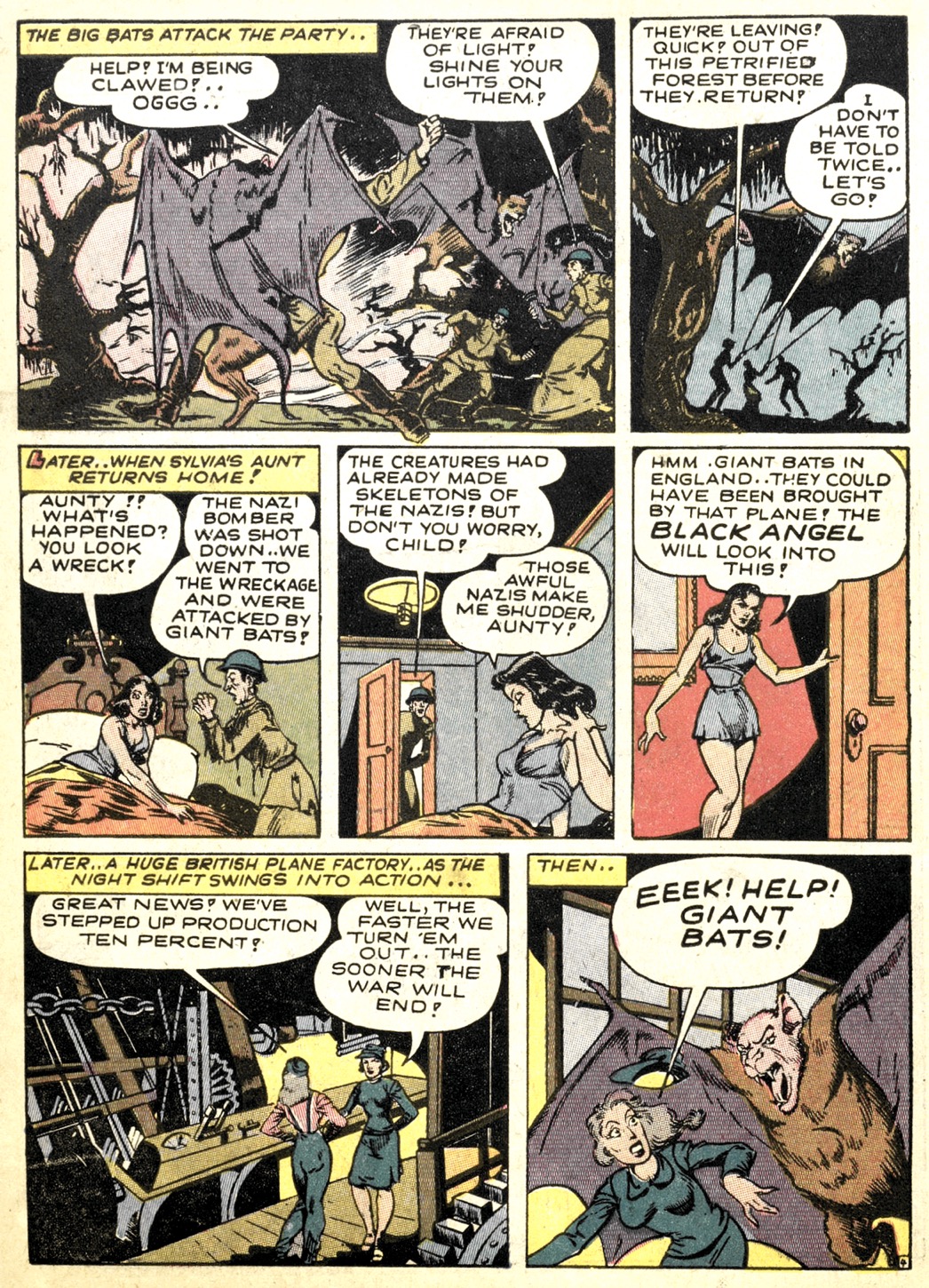 I hinted earlier in the month that we'd look at more weird war horror here in June, so let's do this now with a super sexy action / adventure tale, literally exploding with curvy thrills 'n chills, and featuring one of my favorite WW2 era super heroines, "The Black Angel" as she bashes it out against a battalion of boner-pulling, ratzi nazi bat men from Berlin! If you've never read a Black Angel story before, this could very well be the best place to start! From the March 1943 issue of Air Fighters #6, with very good girl art by jolly John Cassone.