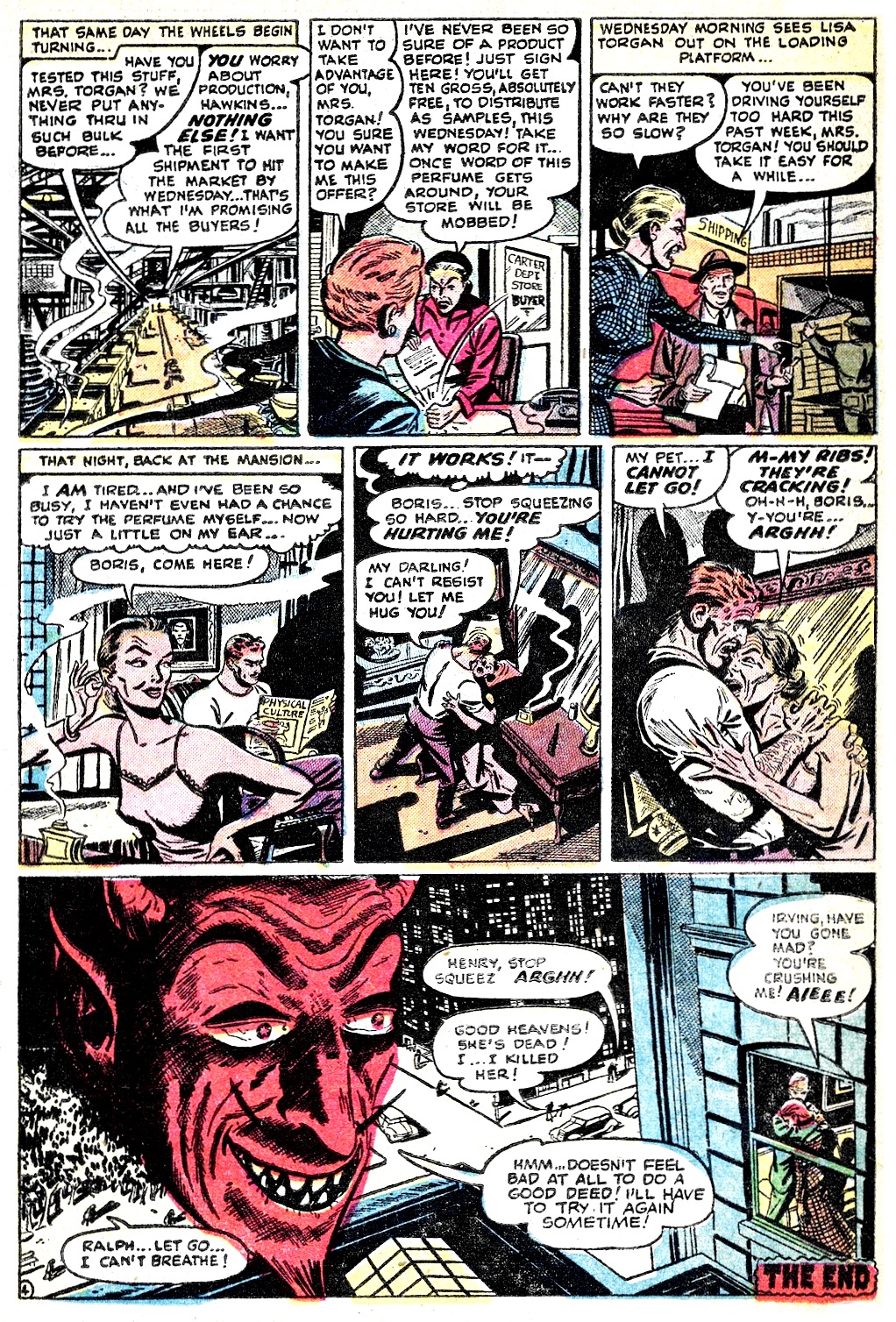 Did you guys honestly think I'd end the month of February with a story about the Devil playing fair for once?! (See previous post, "The Devil and the War Bride.") Umm, think again, darlings! Instead, let's smell the magic and go out in style with a wonderfully epic, 4-page tale by awesome Al Luster about the world's greatest trickster truly doing his part to bring all you lovers together-- even if it kills ya! From the March 1953 issue of Journey into Unknown Worlds #16.
